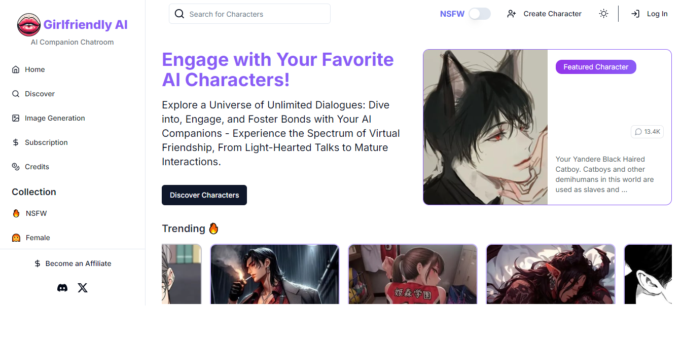 But it’s not just about fascinating discussions because Girlfriendly AI goes way beyond that. It offers an NSFW image generator that allows you to create images of a character of any gender, eye color, hair color, style, and more.